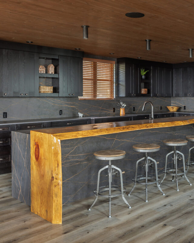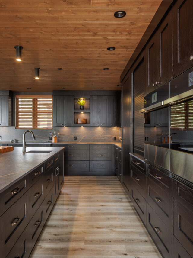 Merit Kitchens’ Whistler oak cabinetry in a deep black stain ties the entire home together, appearing in the kitchen, pantry, bar, vanities, and bedroom armoires. The result is a sophisticated and cohesive environment that blends rustic warmth with contemporary luxury.