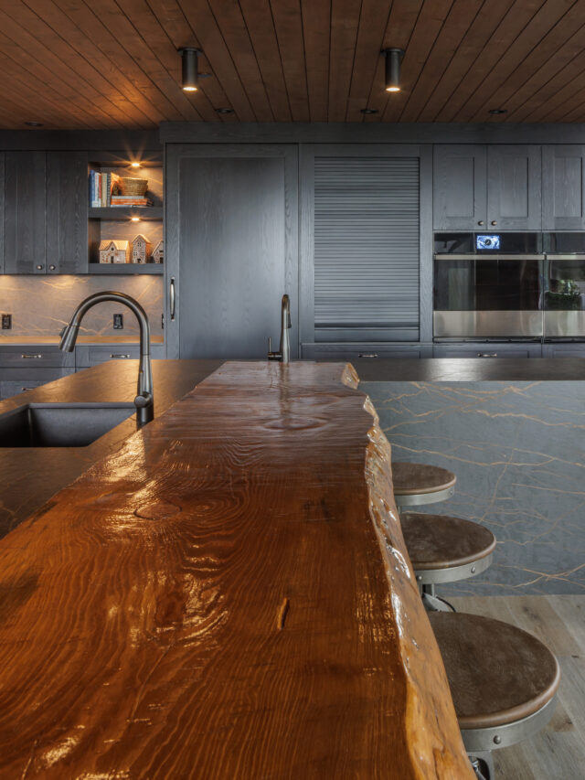 Functionality and hospitality guided the layout. The bar area features two under counter wine coolers and a striking two foot by sixteen foot live edge fir bar top equipped with integrated power. A dedicated appliance garage organizes small appliances with a Richelieu tambour door. The cooktop includes a concealed downdraft vent supported by custom cabinetry detailing. Open niches with thick shelves framed by finished gables allow the backsplash to shine and add visual rhythm.