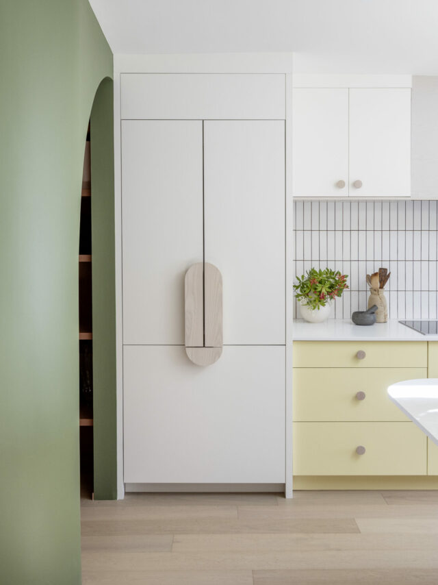 A custom palette of sunny yellow, creamy white, natural oak, rich green, and soft pink brings depth and energy to the room. Tofino style doors finished in a custom yellow paint are framed with white oak to introduce warmth and contrast. A tall appliance cabinet keeps clutter out of sight while remaining easily accessible. Soft curves flow throughout the space, from the half-arched colour blocked pantry and custom hood fan to the rounded island corners and half round wooden hardware.