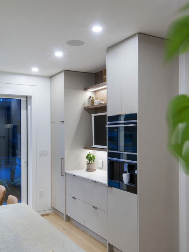 This 270 square foot kitchen in East Vancouver was designed to feel sleek, contemporary, and calming. The clients wanted a space that avoided stark contrasts and glossy finishes, leading to a refined palette of greige matte acrylic cabinetry paired with an eco friendly wood veneer reminiscent of rift cut walnut. The island features a concrete inspired waterfall countertop, while the perimeter uses a warm white surface with soft brown veining that ties the materials together.